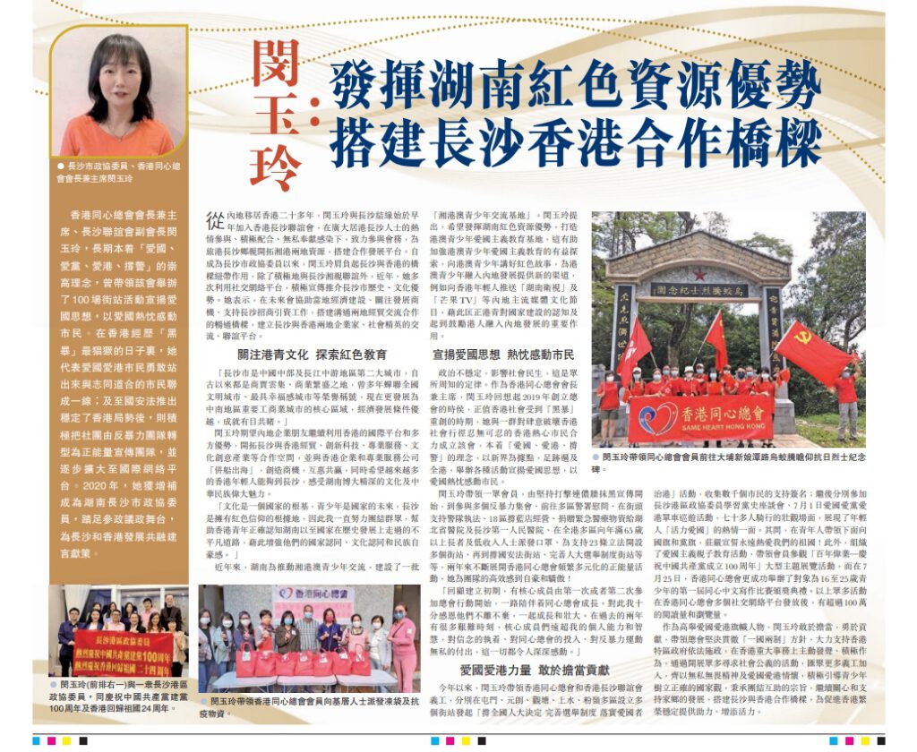 香港同心總會會長兼主席、長沙聯誼會副會長閔玉玲,長期本着「愛國、愛黨、愛港、撐警」的崇高理念,曾帶領該會舉辦了100場街站活動宣揚愛國思想,以愛國熱忱感動市民。在香港經歷「黑暴」最猖獗的日子裏,她代表愛國愛港市民勇敢站出來與志同道合的市民聯成一線;及至國安法推出穩定了香港局勢後,則積極把社團由反暴力團隊轉型為正能量宣傳團隊,並逐步擴大至國際網絡平台。2020年,她獲增補成為湖南長沙市政協委員,踏足參政議政舞台,為長沙和香港發展共融建言獻策。